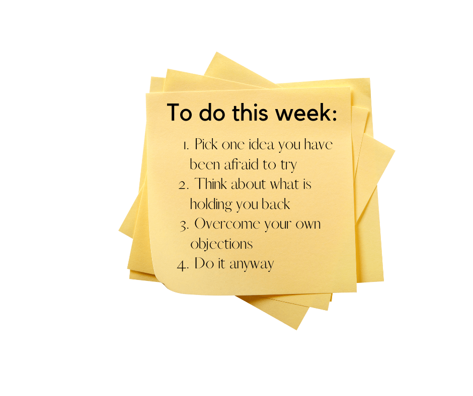 This week I decided it was time for me to do it afraid and figure out how to share my story. I took advice from a good friend who told me the end result isn’t nearly as important as the lessons learned and insights gained along the way. Getting started today, she was right. So here I am. Showing up. Giving it a try. And not being afraid to change, adapt or even fail. What will you do afraid this week?